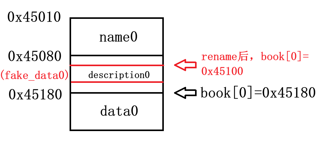我们假定通过合理安排name和description的size,达成了如上格局。使用操作5修改authorname后,book[0]的最低两位被覆盖成0x00,必然减小。此时book[0]指向的位置就变成了假的data0,这个fake_data0位于description0之内。