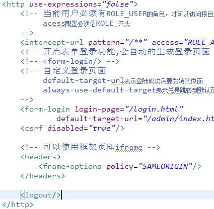 <!-- 设置页面不登录也可以访问 --> <http pattern="/login.html" security="none"></http> <http pattern="/error.html" security="none"></http> <!-- 配置页面的拦截规则 user-expression表示是否启用SPEL表达式,如果不配use-expression默认是true,那么access必须要写hasRole('ROLE_USER') --> <http use-expressions="false"> <!-- 当前用户必须有ROLE_USER的角色,才可以访问根目录以及所属子目录资源 acess配置必须是ROLE_开头 --> <intercept-url pattern="/**" access="ROLE_USER"/> <!-- 开启表单登录功能,会自动的生成登录页面 --> <!-- <form-login/> --> <!-- 自定义登录页面 default-target-url表示登陆成功后要跳转的页面 --> <form-login login-page="/login.html" default-target-url="/index.html" authentication-failure-url="/error.html"/> <csrf disabled="true"/> </http> <!-- 认证管理器 --> <authentication-manager> <!-- 认证提供者 --> <authentication-provider> <user-service> <!-- 配置当前系统的用户 authorities表示当前用户使用哪个角色 --> <user name="admin" password="123456" authorities="ROLE_USER"/> </user-service> </authentication-provider> </authentication-manager>