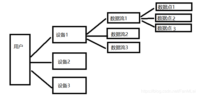 我是这样想的,首先会有一个主账户,也是登陆网站的账户,其下可创建设备,每个设备又都可以创建不同的数据流,数据流由设备publish的主题来区分,数据流又由设备发送过来的一个一个的数据点组成,这样一来共需要4张表存放信息,每张表又和下一级一对多的关系。![]()