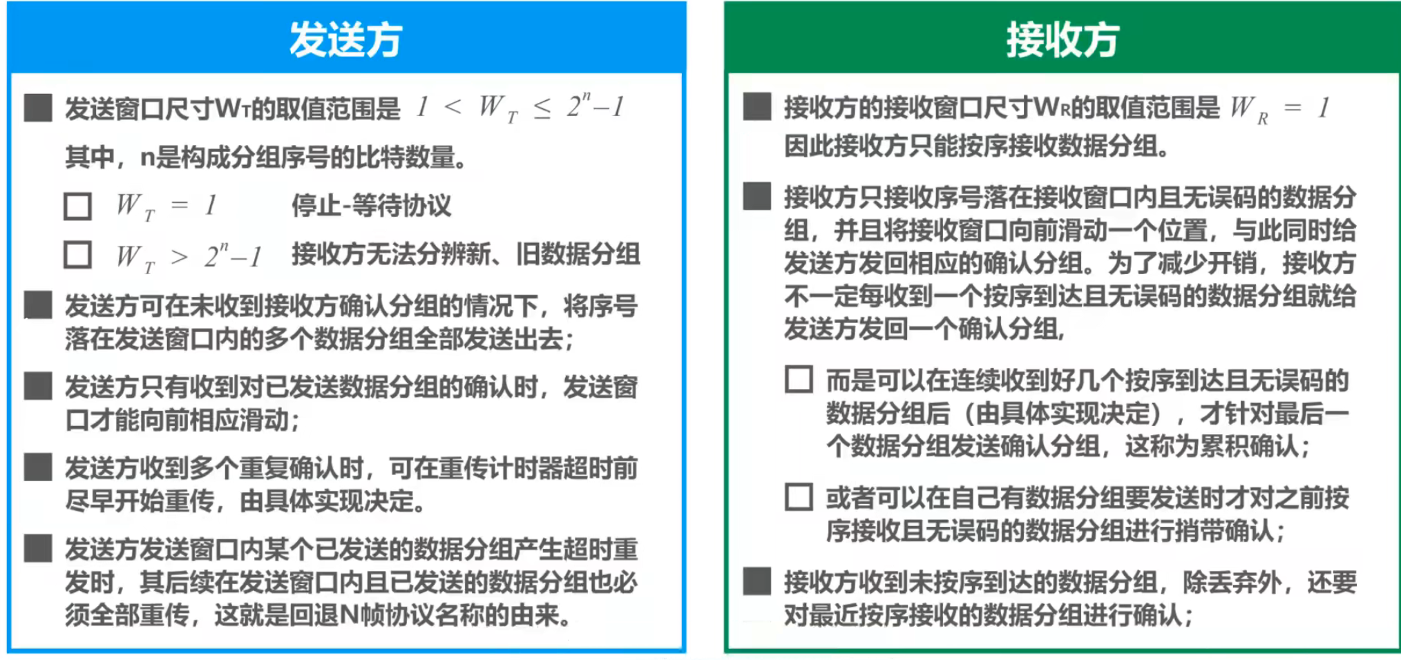 回退N帧:成批发送数据分组。但当一批数据分组到达接收方后,其中一个分组出现误码,其他的正确分组也会受到牵连。