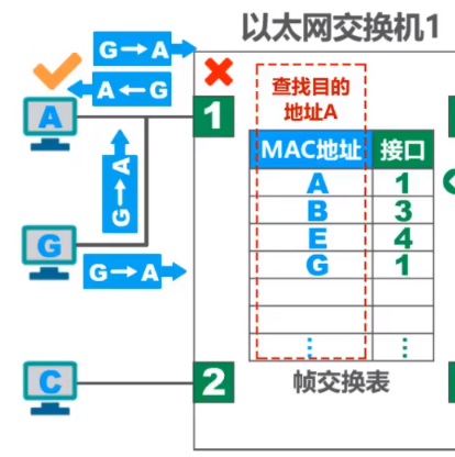 MAC地址G来自接口1,同时交换机发现接口1也是来源,就会丢弃该帧。