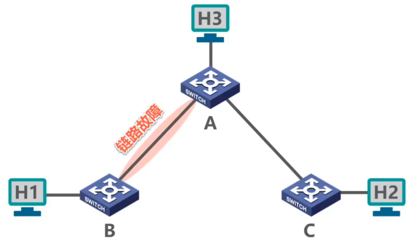 当交换机之间链路较少时,某一条链路发送故障,会导致其中有些主机无法通信,即链路不可靠。 如下图,A与B之间的链路发送故障后,H1便无法与H2和H3进行通信