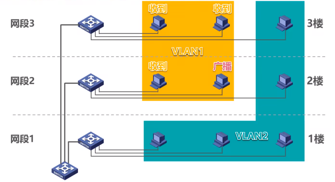 VLAN(Virtual Local Area Network)技术:将局域网内的设备划分成与物理位置无关的逻辑组的技术,这些逻辑组具有某些共同的需求。![]()