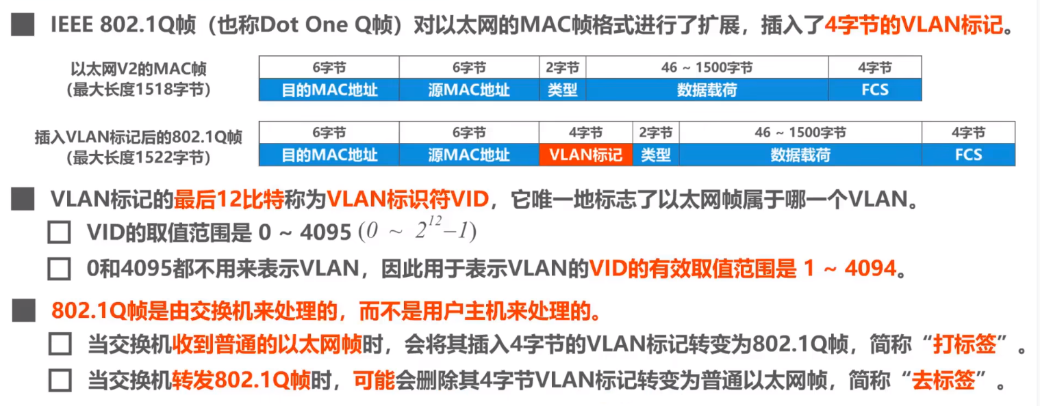 当交换机转发802.1Q帧时,可能会删除其4字节VLAN标记转变为普通以太网帧,简称“去标签”