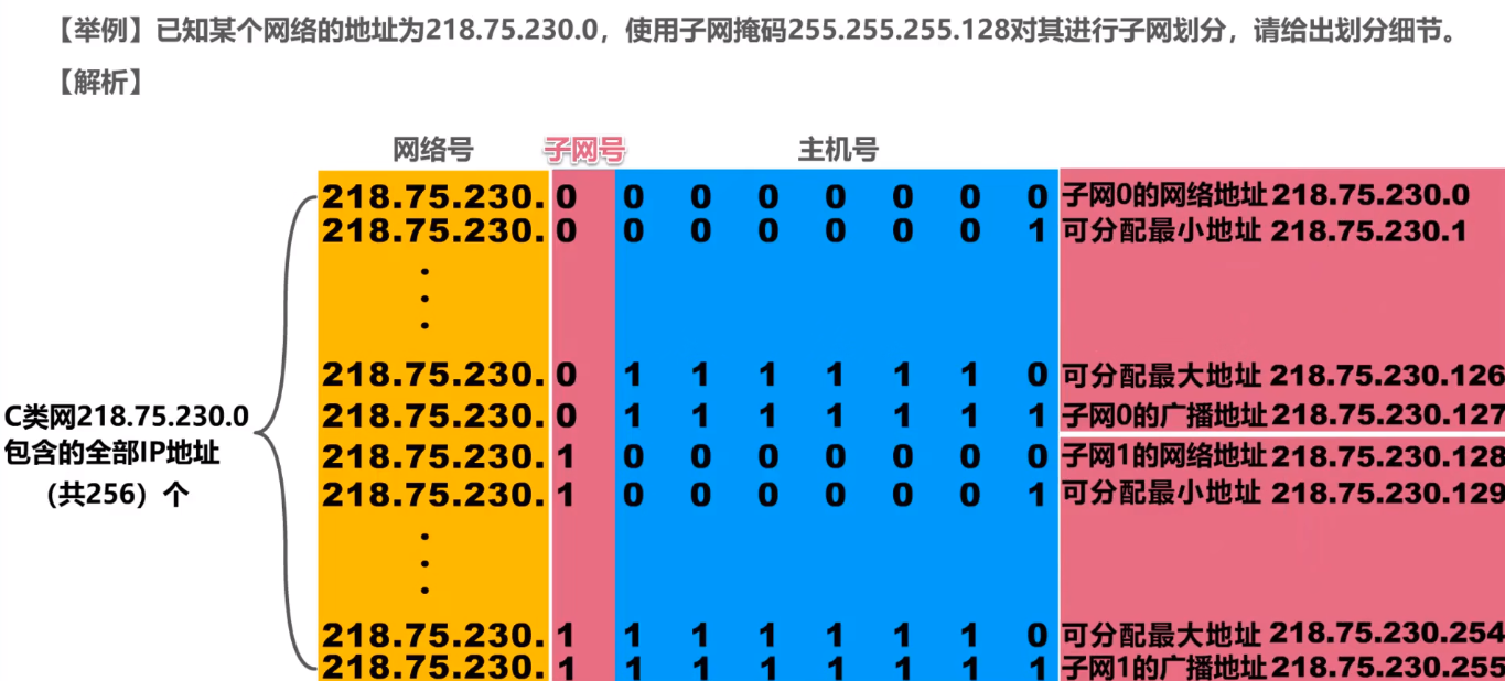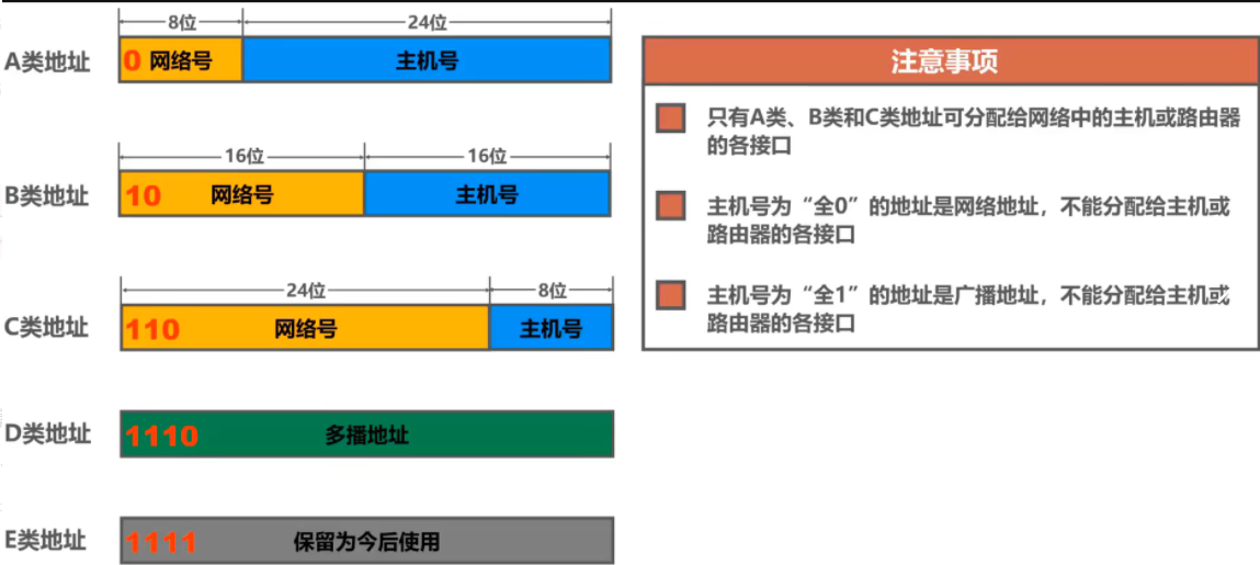 注意 A、B、C类地址的二进制前缀,以及对应的网络号和主机号位数。