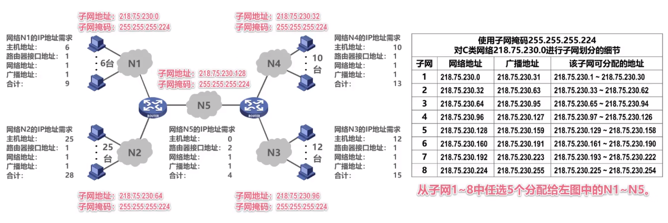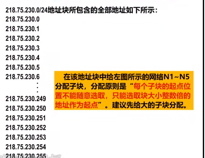 分析后可知,划分需求是:从地址块218.75.230.0/24中取出5个地址块: