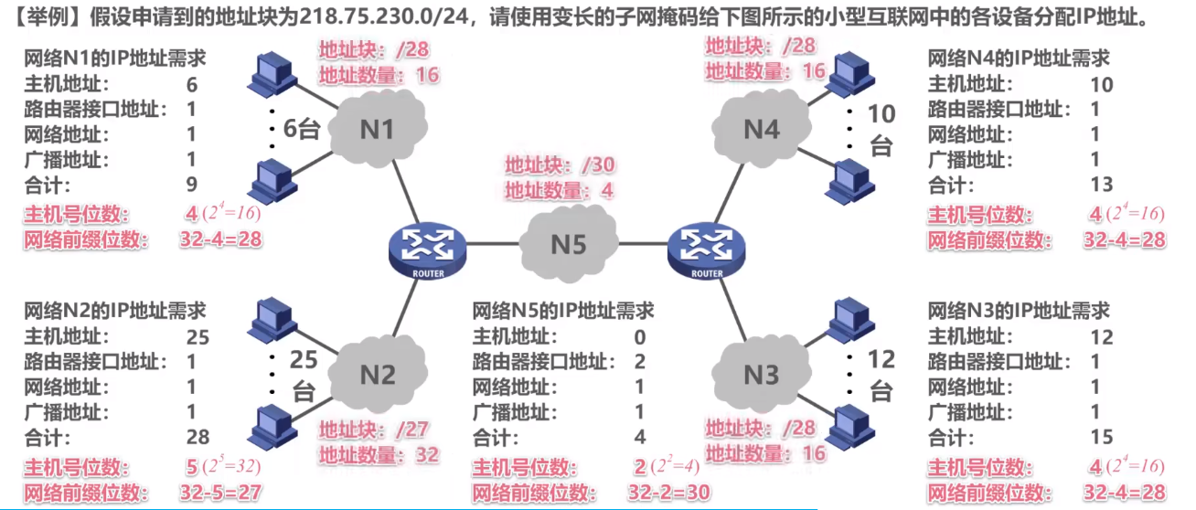 ”假设申请到的地址块为218.75.230.0/24,请使用变长的子网掩码给下图所示的小型互联网中的各设备分配IP地址“