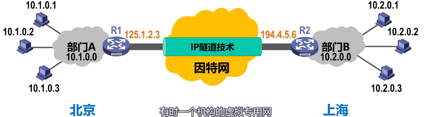 数据报在因特网中可能要经过多个网络和路由器,但从逻辑上看,R1和R2之间好像是一条直通的点对点链路,因此也被称为IP隧道技术。