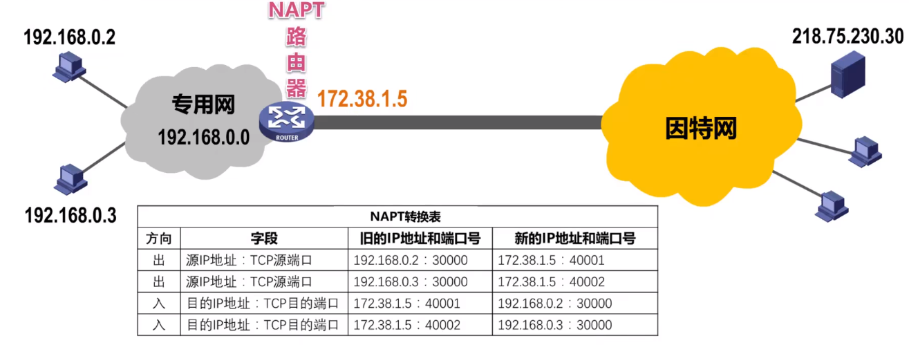 这样,用一个全球IP地址就可以使多个拥有本地地址的主机同时和因特网上的主机进行通信。这种将端口号和IP地址一起进行转换的技术叫作网络地址与端口号转换NAPT