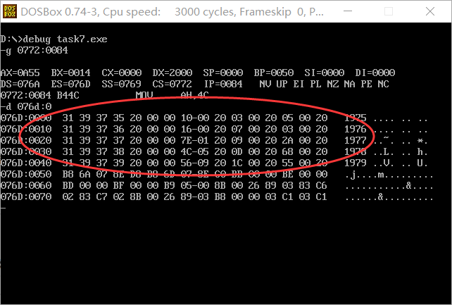 ① 在debug中将执行到line17结束、line19之前,记录此时:寄存器(DS) = _076A___, 寄存器(SS) = __076B__, 寄存器(CS) = _076C___