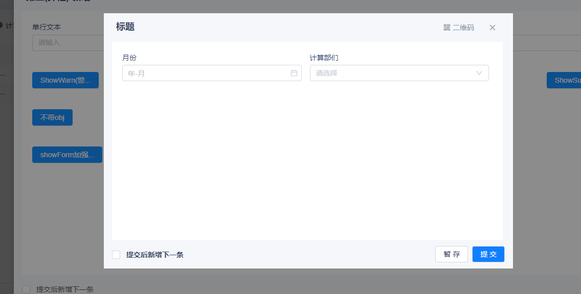 //弹出表单窗口 if( action == "showForm" ) { var schemaCode = "D00203306982e22e02441568a05a458bb45358c";//SchemaCode表单编码参数,需要打开的窗口编码 var objectId = ""; //BizObjectID不传时打开新增时的表单 var params = { SeasonObjectiveID: "" };//传递到表单的参数 JSON对象格式 var checkIsChange = false;//是否检查修改 var showlist = false;//兼容移动端是否显示列表 var showInModal = true;//是否弹出框中显示,如果为false,title height width OnShowCallback OnHiddenCallback 等属性不起作用 $.IShowForm( schemaCode, objectId, params, checkIsChange, showlist, { showInModal: true, title: "标题", height: 500, width: 800, OnShowCallback: function( da ) { }, onHiddenCallback: function( data ) { } }); //OnShowCallback 显示时事件 onHiddenCallback 隐藏时事件 }