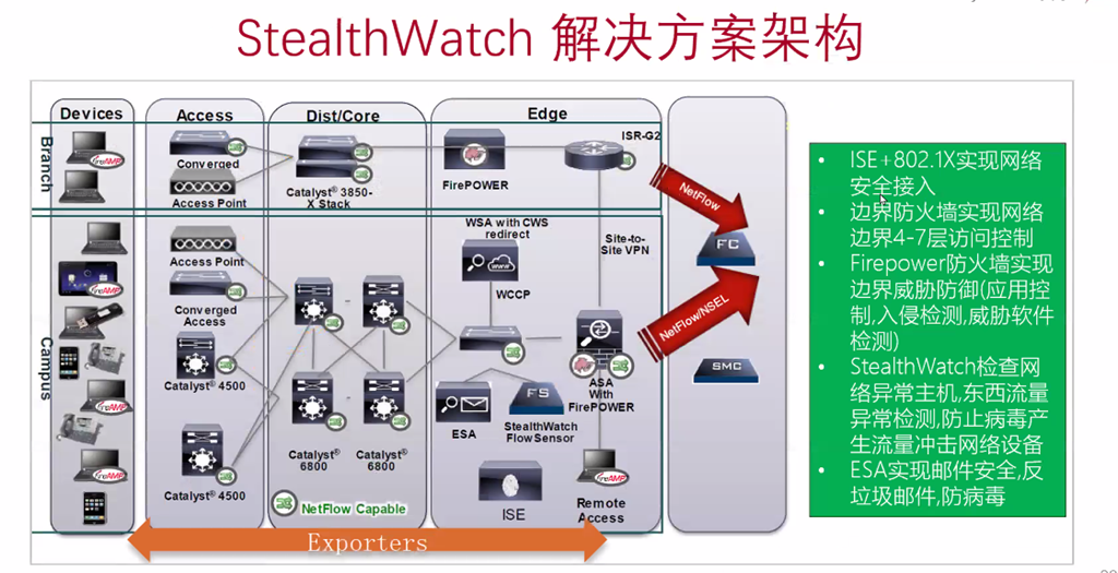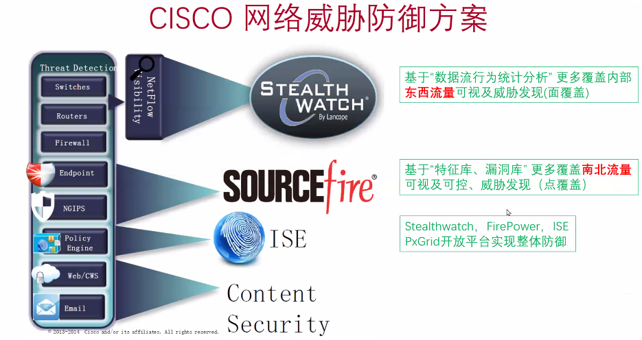 在Cisco的整体方案中,Stealth watch 针对东西向流量的可视及威胁发现,同时firepower[下一代防火墙]主要针对南北流量的可视可控及威胁发现,ISE则是一个整合点,Stealthwatch,FirePower及ISE可以通过PxGrid实现联动,从而实现网络的整体防御;
