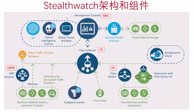 在stealth watch中主要有SMC[Stealthwatch Management Console],FC[Flow Collector],FS[Flow Sensor],UDPD[UDP Director] 这几个组件,如下图: