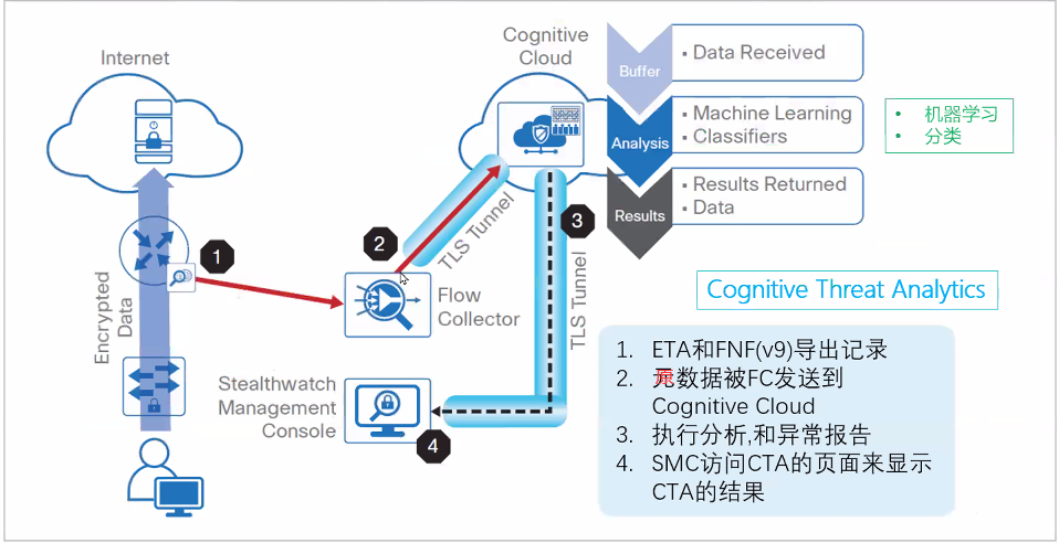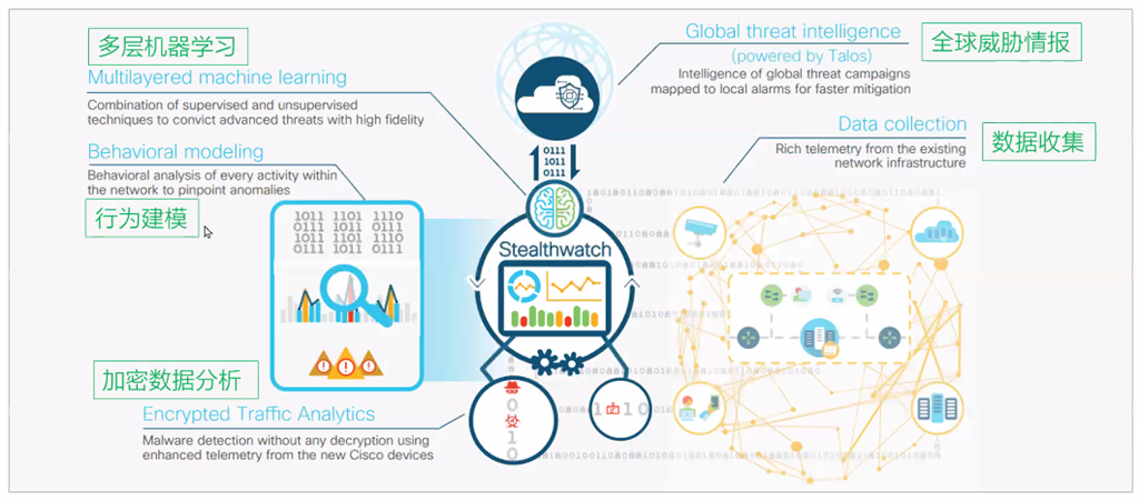 思科Stealthwatch利用 NetFlow 来监控网络、数据中心、分支机构和云环境,其高级安全分析功能可发现对扩展网络的隐秘攻击。Stealthwatch可利用现有的网络作为安全传感器和执行器,大幅增强威胁防御能力。最大的优势在于,搭配完整后的这套系统可以实现加密流量分析。简单说,就是内网流量监控分析产品,其出现的主要原因之一是来自于加密流量的威胁日益增多,Cisco架构中的位置: