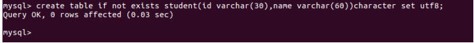 (32)在sc中创建一个表格:create table if not exists student(id varchar(30),name varchar(60))character set utf 8;