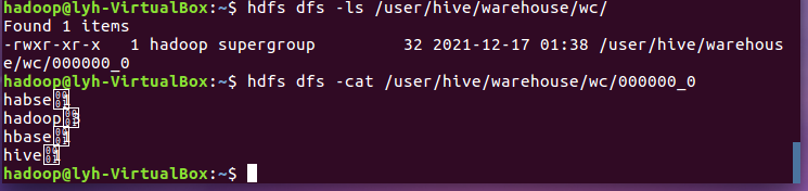 - 从hdfs导入文件内容到表wctext, 并查看hdfs源文件,hfds数据库文件