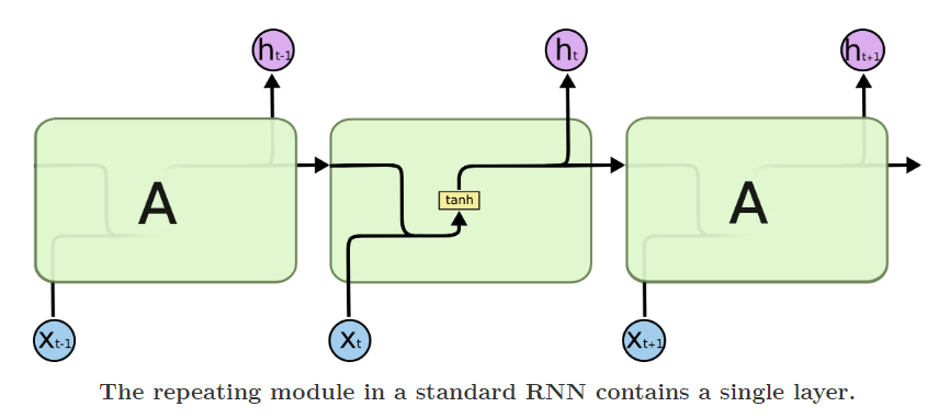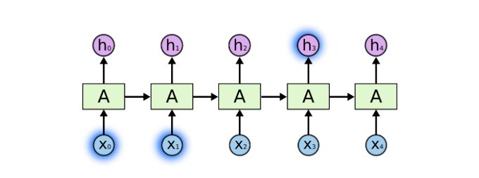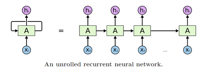 在上图中,神经网络块 A,不断地接收Xt输入,并输出值ht。循环使得将信息从网络的一个步骤传递到下一个步骤。
