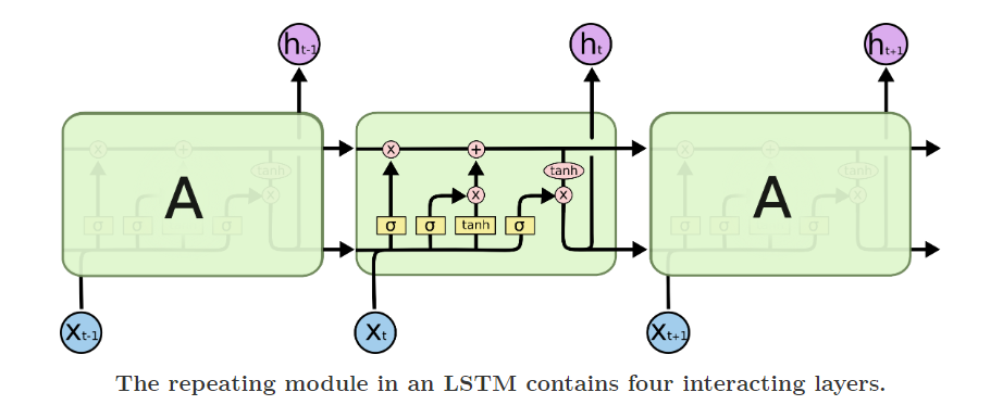 LSTMs也具有这种链式结构,但是它的重复单元不同于标准RNN网络里的单元只有一个网络层,它的内部有四个网络层。LSTMs的结构如下图所示。