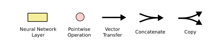 图中黄色方块是学习的神经网络层,似于CNN里的激活函数操作,粉色圆圈表示点乘操作,单箭头表示数据流向,箭头合并表示向量的合并(concat)操作,箭头分叉表示向量的拷贝操作。
