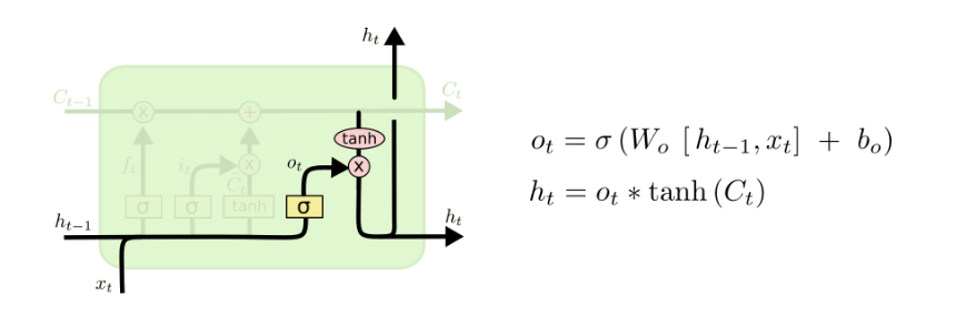 来判断输出细胞的哪些状态特征,这里需要将输入经过一个称为输出门的sigmoid层得到判断条件,然后将细胞状态经过tanh层得到一个-1~1之间值的向量,该向量与输出门得到的判断条件相乘就得到了最终该RNN单元的输出。该步骤如下图所示
