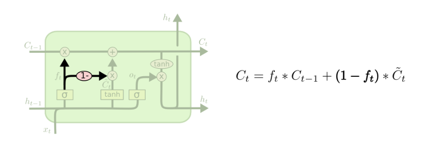 另一个变化是使用耦合的忘记门和输入门。不同于之前的LSTM结构,我们利用所有信息来做决定,而不是分别决定要忘记什么以及应该向其中添加新信息。 我们只会在要输入某些内容时才忘记它。 我们只会在忘记较旧的内容时才向状态输入新值。