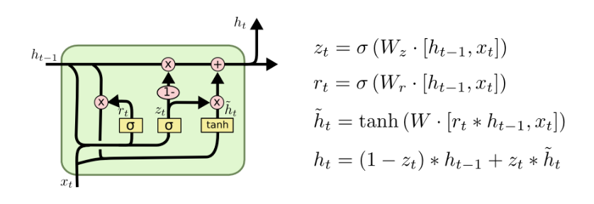 其中重置门为上图中前面那个门,决定了如何将新的输入信息与前面的记忆相结合。更新门为上图中后面那个门,定义了前面记忆保存到当前时间步的量。由于该变式的简单有效,后来被广泛应用。