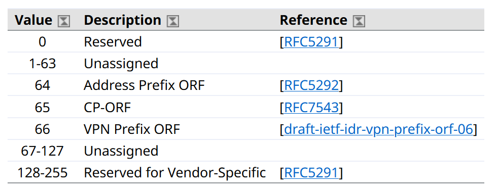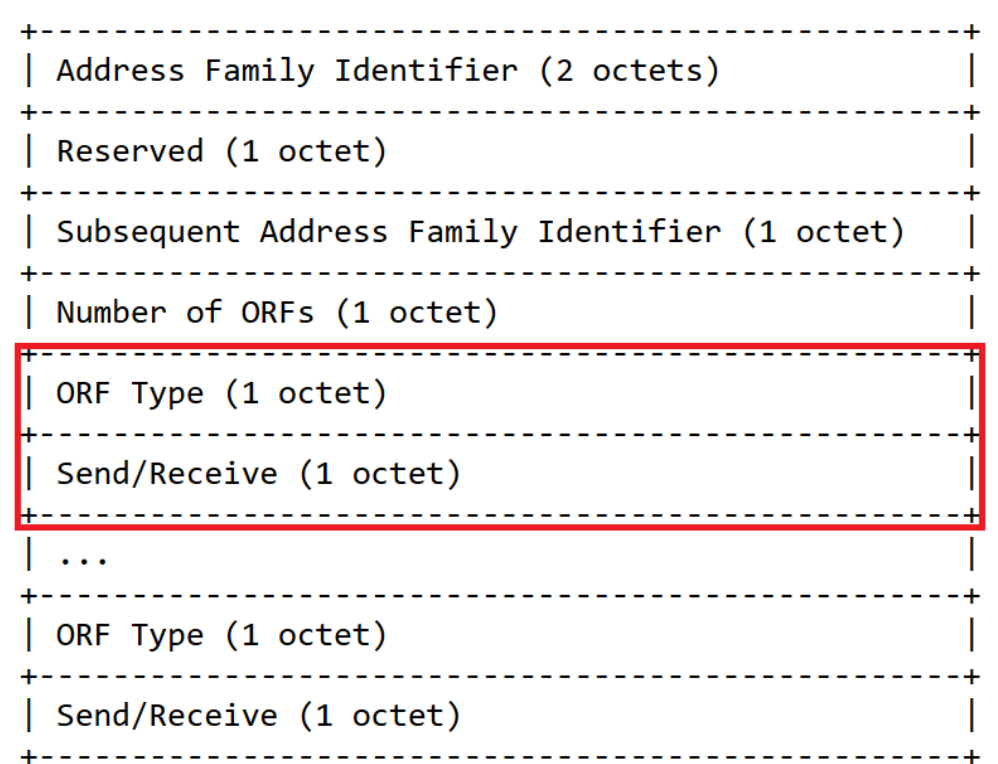 值 1 表示发送者愿意从 BGP peer 接收 ORF 条目,值 2 表示发送者愿意向 BGP peer 发送 ORF 条目,值 2 表示两者都有。只有当 BGP 邻居之间具有相匹配的 ORF 需求是,BGP Speaker 才能向其 BGP peer 发送包含一个或多个 ORF 条目的 BGP ROUTE-REFRESH 消息。