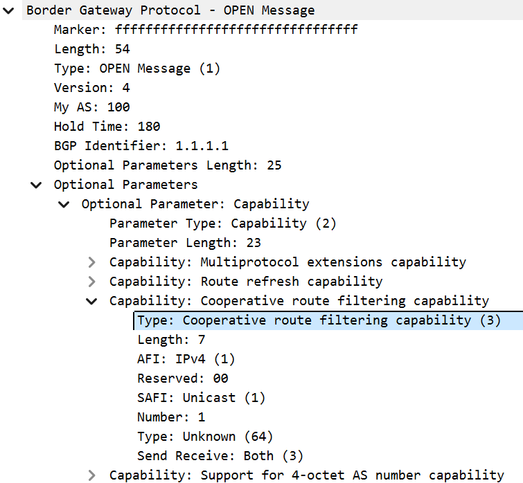 BGP Open 消息携带 Outbound Route Filtering Capability 示例。