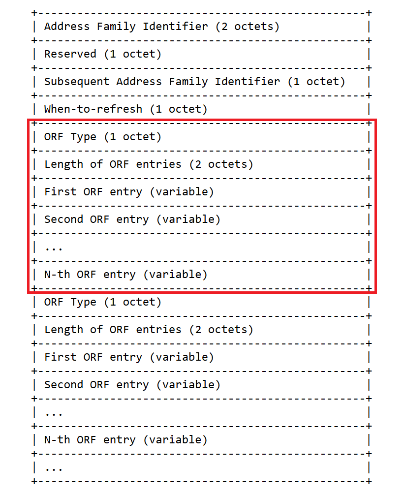 在《RFC5292-Address-Prefix-Based Outbound Route Filter for BGP-4》中定义了如上所示的 ORF Type 64 = Address-Prefix-Based ORF 编码格式。