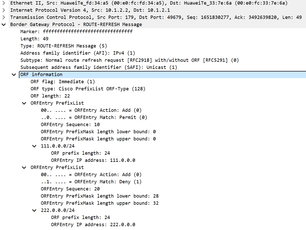 发送 Route-Refresh 报文携带 ORF 信息示例。ORF Type 128 为厂商私有封装格式,此处与 ORF Type 64 = Address-Prefix-Based ORF 相同而作为示例展示。