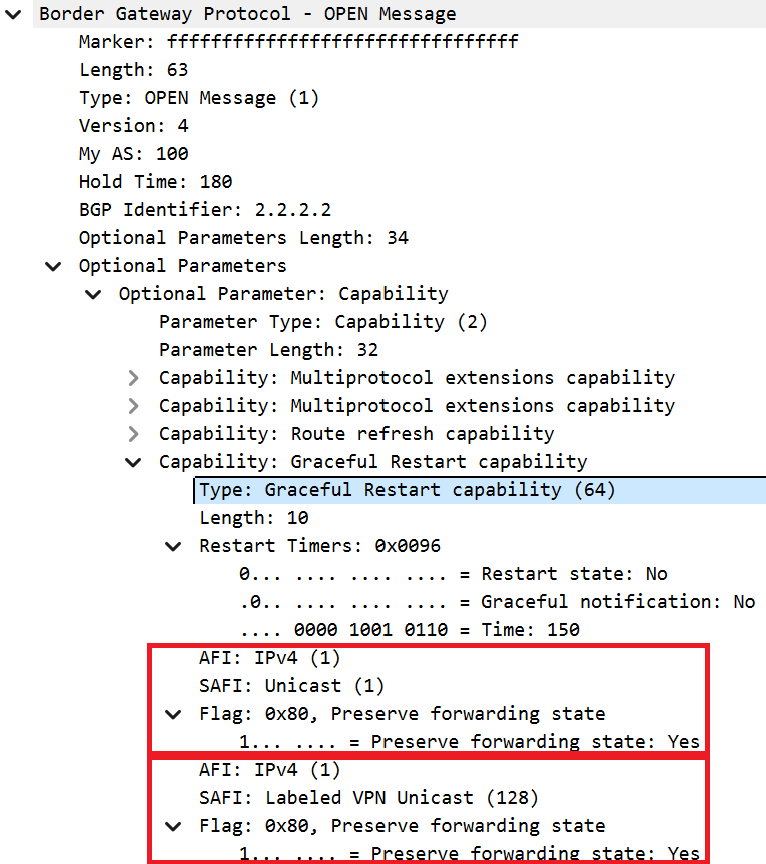 BGP Open 消息中携带 Graceful Restart Capability 的示例,其中既有 IPv4 Unicast 地址族又有 VPNv4 地址族。