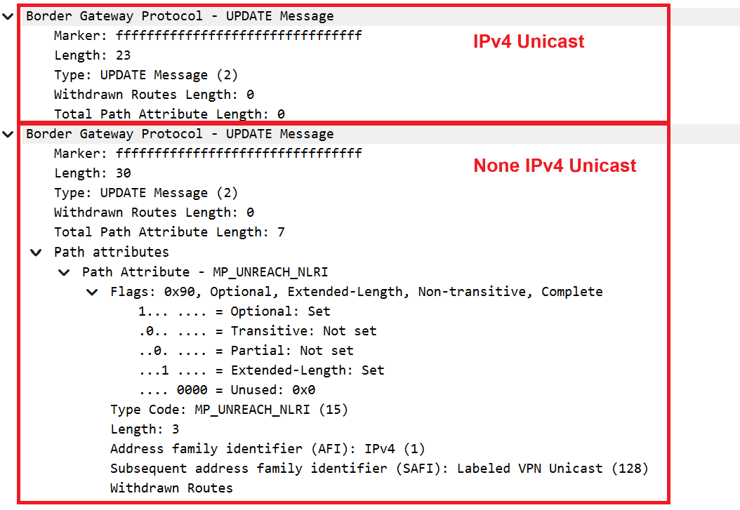 对于其他地址族而言,End-of-RIB 标记是一个仅包含没有 withdrawn 路由 MP_UNREACH_NLRI attribute 的 Update 消息。