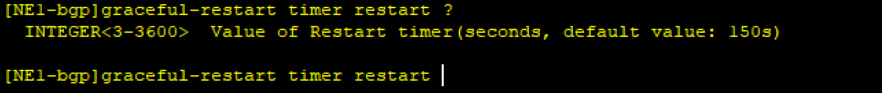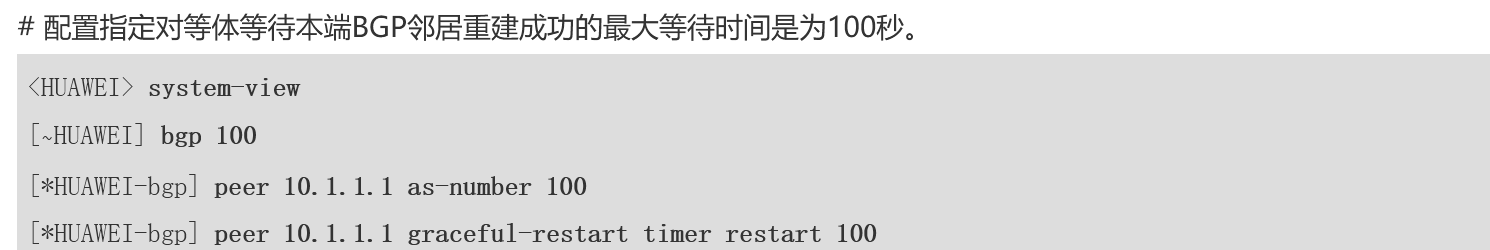 peer graceful-restart timer restart 用于针对 peer 设置对端等待本端 BGP 邻居重建成功的最大等待时间。