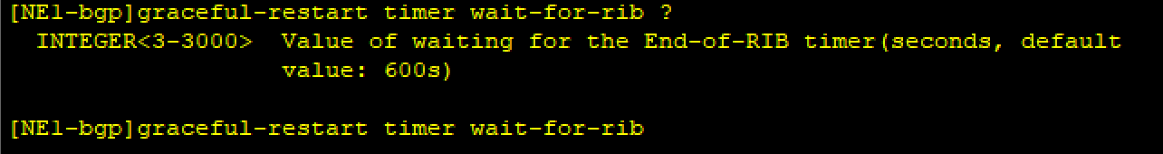 peer graceful-restart timer wait-for-rib 用来配置等待指定对等体组 End-Of-RIB 标记的最大等待时间。当本端与对端重新建立 BGP session 之后,应在此时间内收到对端的 End-Of-RIB 标记。否则退出GR过程,从现有路由中选取最佳路由。