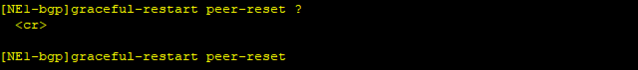 graceful-restart peer-reset 可以配置设备以 GR(Graceful Restart) 方式复位 BGP 连接。如果配置此命令,则在原有地址族基础上创建其他地址族的 BGP 邻居关系时,BGP 将进入 GR 重新进行能力协商。在这个过程中原有地址族的路由表项不会删除。