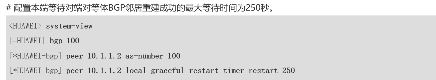 peer local-graceful-restart timer restart 可以用来配置本端等待对端对等体BGP邻居重建成功的最大等待时间。默认最大等待时间是 150s。此时当本端发现对端处于 Down 状态时进入 GR 过程,本端应在此时间内与对端成功建连,否则从现有路由中选取最佳路由。