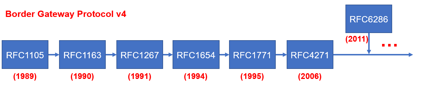 Border Gateway Protocol自1989年定义以来已经历过4个版本:1989年RFC1105的Version1,1990年RFC1163的Version2,1991年RFC1267的Version3,1994年RFC1654的Version4。而V4又历经了几次迭代,到目前比较全面完整的是2006年发布的RFC4271。