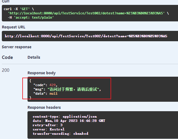 "IpRateLimiting": { //false则全局将应用限制,并且仅应用具有作为端点的规则* 。 true则限制将应用于每个端点,如{HTTP_Verb}{PATH} "EnableEndpointRateLimiting": false, //false则拒绝的API调用不会添加到调用次数计数器上 "StackBlockedRequests": false, //注意这个配置,表示获取用户端的真实IP,我们的线上经过负载后是 X-Forwarded-For,而测试服务器没有,所以是X-Real-IP "RealIpHeader": "X-Real-IP", "ClientIdHeader": "X-ClientId", "HttpStatusCode": 200, "QuotaExceededResponse": { "Content": "{{\"code\":429,\"msg\":\"访问过于频繁,请稍后重试\",\"data\":null}}", "ContentType": "application/json", "StatusCode": 200 }, "IpWhitelist": [], "EndpointWhitelist": [], "ClientWhitelist": [], "GeneralRules": [ { "Endpoint": "*",//* "Period": "5s", "Limit": 3 } ] }, "IpRateLimitPolicies": { //特点Ip限制规则设置 //ip规则 "IpRules": [ { //IP "Ip": "84.247.85.224", //规则内容 "Rules": [ //1s请求10次 { "Endpoint": "*", "Period": "1s", "Limit": 10 }, //15分钟请求200次 { "Endpoint": "*", "Period": "15m", "Limit": 200 } ] }, { //ip支持设置多个 "Ip": "192.168.3.22/25", "Rules": [ //1秒请求5次 { "Endpoint": "*", "Period": "1s", "Limit": 5 }, //15分钟请求150次 { "Endpoint": "*", "Period": "15m", "Limit": 150 }, //12小时请求500次 { "Endpoint": "*", "Period": "12h", "Limit": 500 } ] } ] }