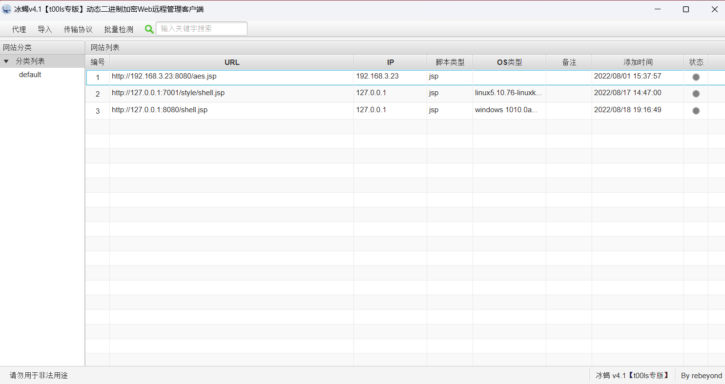 - header头顺序是颠倒的2、发送包是base64,返回包是字节数组,所以会乱码3、如果冰蝎密码不对,会出现两个连接,第一个是post 第二个是get