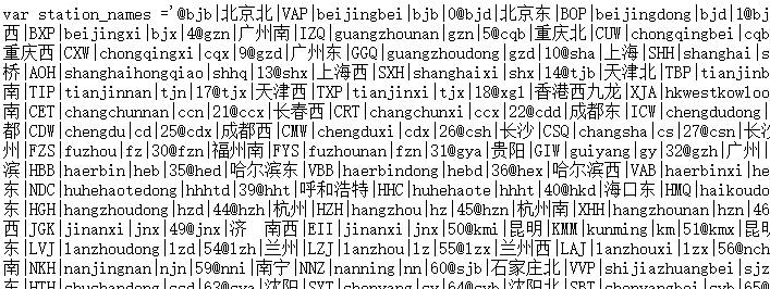 根据查看12306网站的html可以发现,站点都是用代码进行代替的,如:北京的代码为“BJP”,而我们在实际输入的时候不可能再去查询站点的代码,所以需要将中文站点转换为对应的代码。