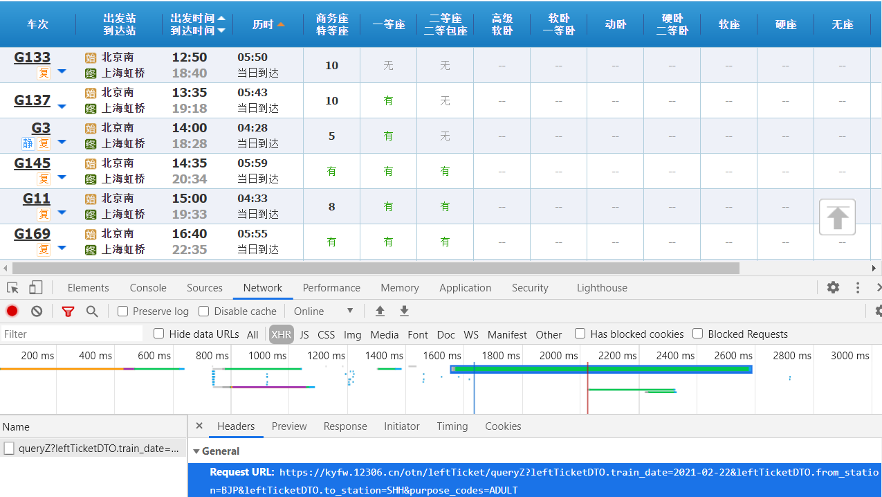 "Cookie": "_uab_collina=161396635873945822102574; JSESSIONID=631FB91746707366DCBBA5BE2C7453A1; BIGipServerotn=1106248202.24610.0000; RAIL_EXPIRATION=1614230065687; RAIL_DEVICEID=io7zYXeM-Gz8YUk5ZnOn0GjmqcUoFTj4kauIJForuflzNbyVp0X8kMyAxmqJYYJAhD8NCH3XBPNqdP3i225ICWhEvFl8Rr854pgCzjRbeBru9zok8pfJayROxlXHA4KMD4zV5AlBd8SqAbVVZbCvtviysCtLN_CH; BIGipServerpool_passport=165937674.50215.0000; route=c5c62a339e7744272a54643b3be5bf64; _jc_save_fromStation=%u5317%u4EAC%2CBJP; _jc_save_toStation=%u4E0A%u6D77%2CSHH; _jc_save_fromDate=2021-02-22; _jc_save_toDate=2021-02-22; _jc_save_wfdc_flag=dc",