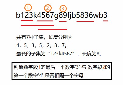- 找出是否有相邻的数字段间只隔一个字母,返回其长度。注意,每段数字可能与其前后的数字段都只相隔一个字母,此时,该数字段要重复使用,如图片中的数字段2。
