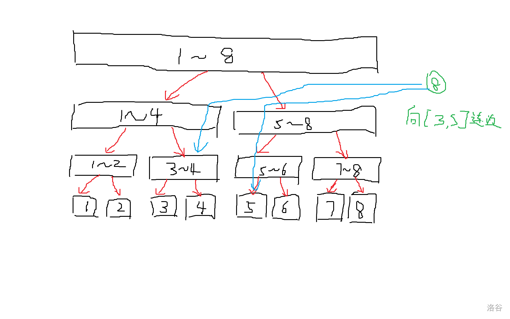 例如,我们要让 \(8\) 号结点向 \([3,5]\) 内所有结点连边。