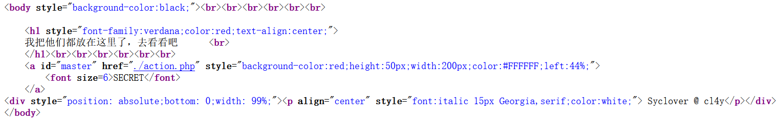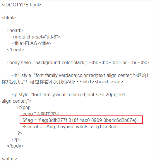 PCFET0NUWVBFIGh0bWw+Cgo8aHRtbD4KCiAgICA8aGVhZD4KICAgICAgICA8bWV0YSBjaGFyc2V0PSJ1dGYtOCI+CiAgICAgICAgPHRpdGxlPkZMQUc8L3RpdGxlPgogICAgPC9oZWFkPgoKICAgIDxib2R5IHN0eWxlPSJiYWNrZ3JvdW5kLWNvbG9yOmJsYWNrOyI+PGJyPjxicj48YnI+PGJyPjxicj48YnI+CiAgICAgICAgCiAgICAgICAgPGgxIHN0eWxlPSJmb250LWZhbWlseTp2ZXJkYW5hO2NvbG9yOnJlZDt0ZXh0LWFsaWduOmNlbnRlcjsiPuWViuWTiO+8geS9oOaJvuWIsOaIkeS6hu+8geWPr+aYr+S9oOeci+S4jeWIsOaIkVFBUX5+fjwvaDE+PGJyPjxicj48YnI+CiAgICAgICAgCiAgICAgICAgPHAgc3R5bGU9ImZvbnQtZmFtaWx5OmFyaWFsO2NvbG9yOnJlZDtmb250LXNpemU6MjBweDt0ZXh0LWFsaWduOmNlbnRlcjsiPgogICAgICAgICAgICA8P3BocAogICAgICAgICAgICAgICAgZWNobyAi5oiR5bCx5Zyo6L+Z6YeMIjsKICAgICAgICAgICAgICAgICRmbGFnID0gJ2ZsYWd7M2RmYjI3N2YtMzE4Zi00YWMwLTg5MDktM2JhNGM2ZDJiMDdlfSc7CiAgICAgICAgICAgICAgICAkc2VjcmV0ID0gJ2ppQW5nX0x1eXVhbl93NG50c19hX2cxcklmcmkzbmQnCiAgICAgICAgICAgID8+CiAgICAgICAgPC9wPgogICAgPC9ib2R5PgoKPC9odG1sPgo=