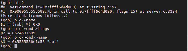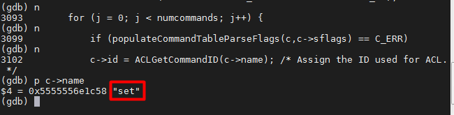 介绍完上面两个比较关键的结构体后,我们仍旧以set及其对应的setCommand方法为例,在populateCommandTable()方法中,我们会根据redisCommandTable表中的内容一个个进行初始化,当初始化到set的时候,我们gdb调试跟踪到其内容如下: