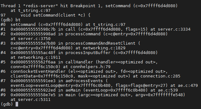 当我们redis-server启动之后,redis-cli通过set命令执行的时候,其堆栈调用流程如下:
