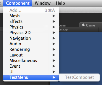 可以在UnityEditor的Component的Menu中增加自定义的项目。菜单可以设置多级,使用斜线/分隔即可。在Hierarchy中选中GameObject的时候,点击该菜单项,就可以在GameObject上追加该Component。