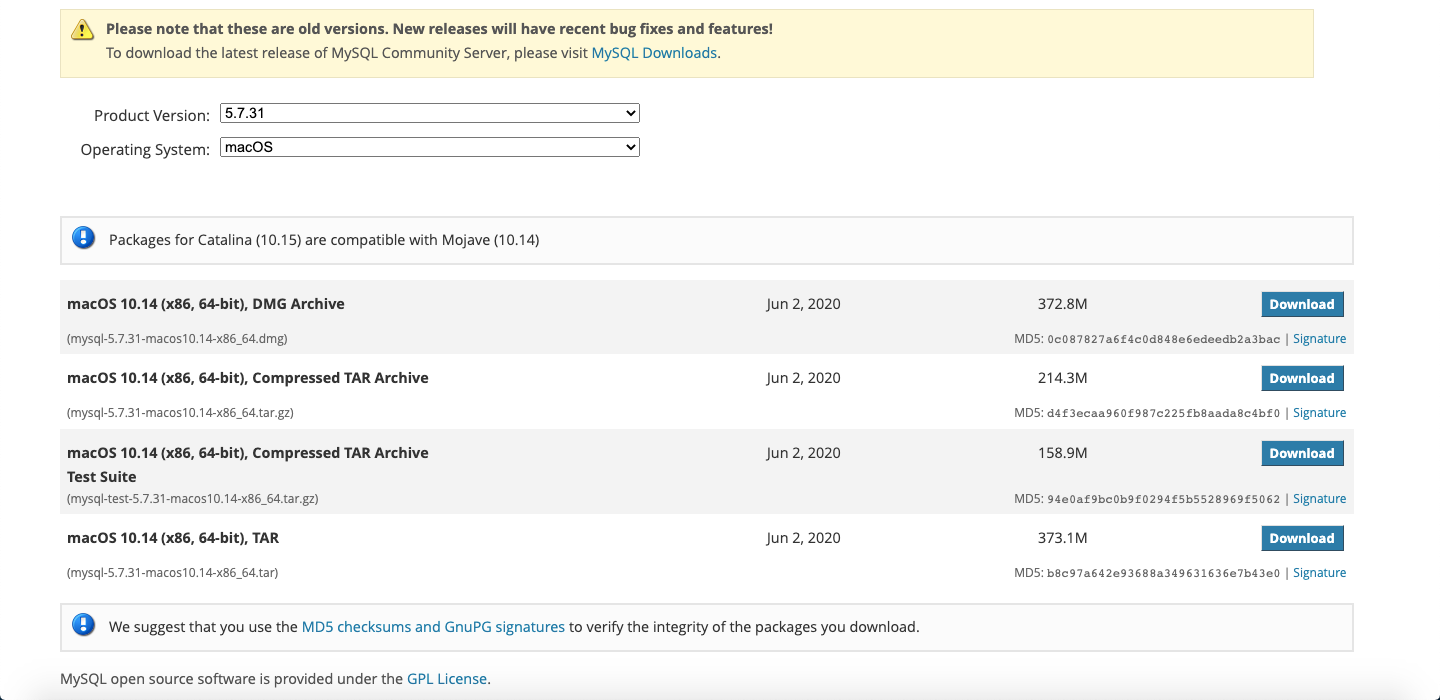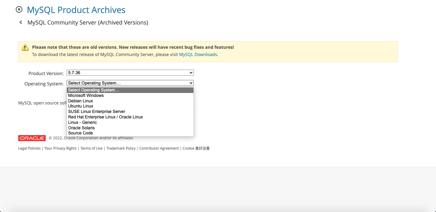 可以发现 MySQL 5.7(5.7.32~5.7.36)都没提供macOS的安装