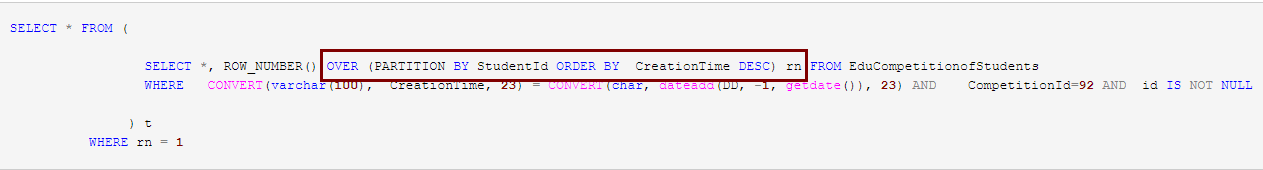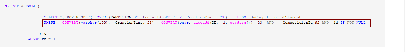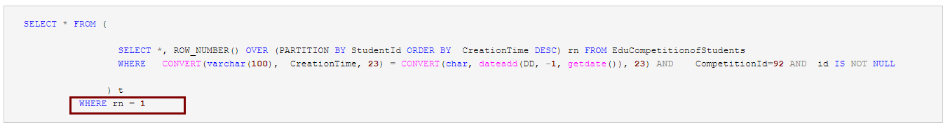 SELECT * FROM ( SELECT *, ROW_NUMBER() OVER (PARTITION BY StudentId ORDER BY CreationTime DESC) rn FROM EduCompetitionofStudents WHERE CONVERT(varchar(100), CreationTime, 23) = CONVERT(char, dateadd(DD, -1, getdate()), 23) AND CompetitionId=92 AND id IS NOT NULL ) t WHERE rn = 1